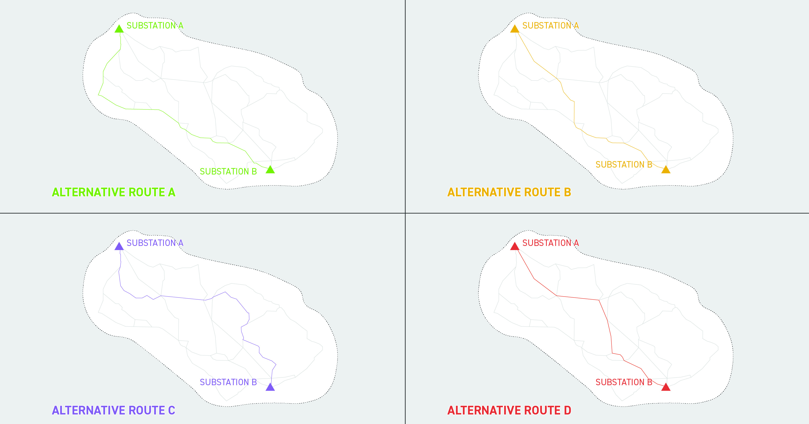 We implement a comprehensive routing process that takes land use, the environment, public input and engineering guidelines into account to develop a transmission line route. The information below illustrates each stage of the routing process.